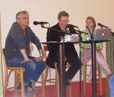 "Do you copy?" undrade OEI:s Jonas (J) Magnusson under ett av lördagens samtal, här flankerad av Boris Buden, författare och redaktör för Arkzin i Zagreb under 90-talet, och Zandra Ahl, som kritiserar designetablissemanget i fanzinet Slicker.